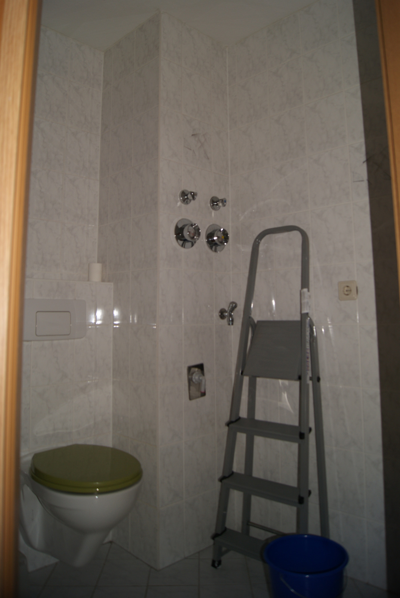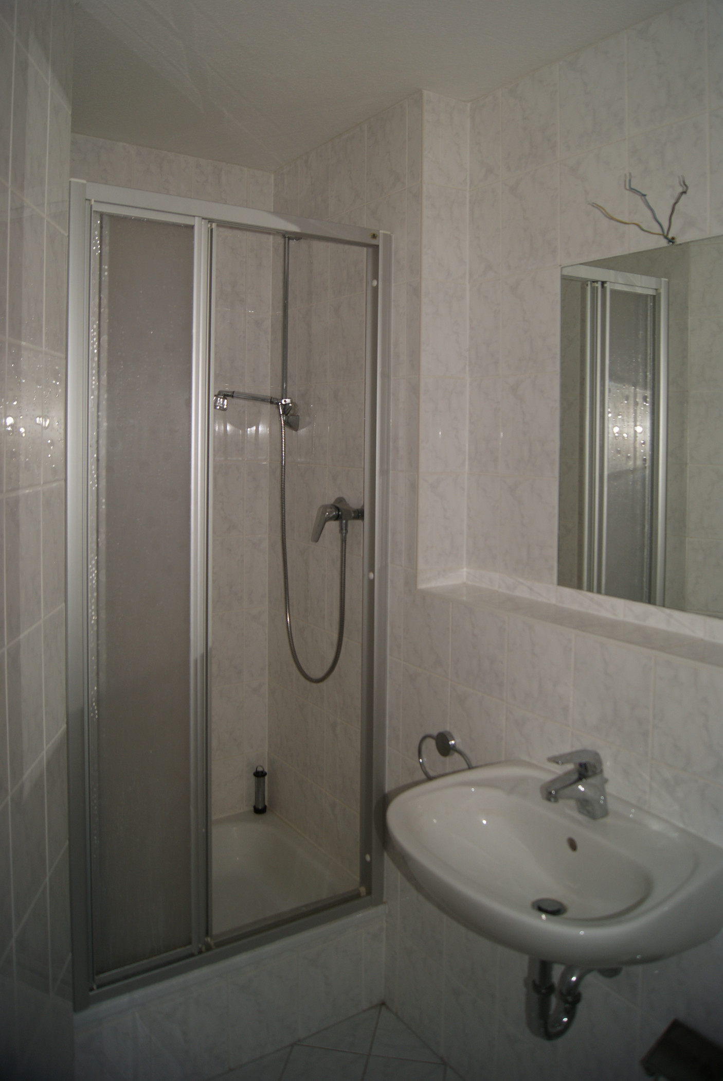 - gefliestes Bad mit Dusche, Handwaschbecken und WC