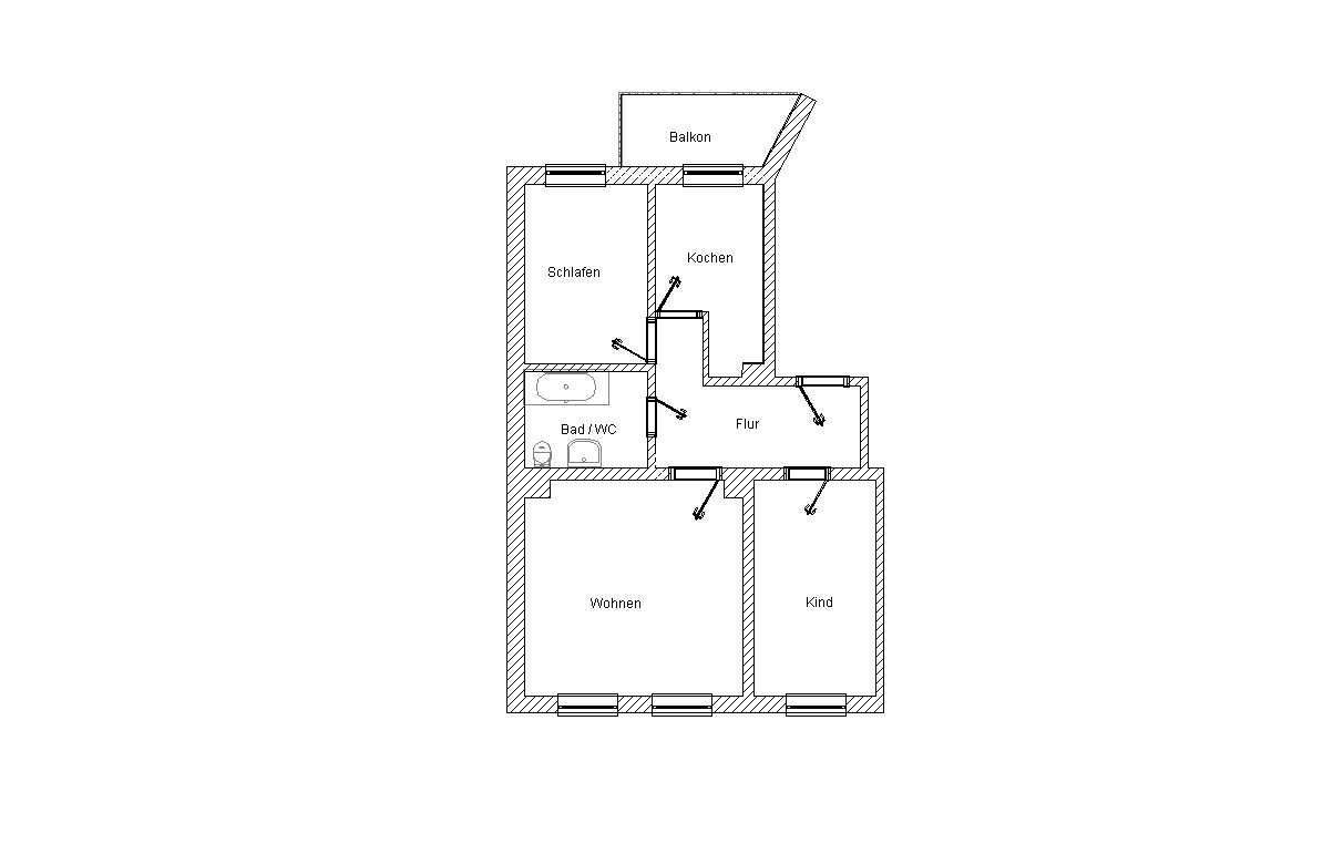 - Aufteilung der Wohneinheit: Wohnen, Schlafen, Kind, Küche, Bad, Flur und Balkon