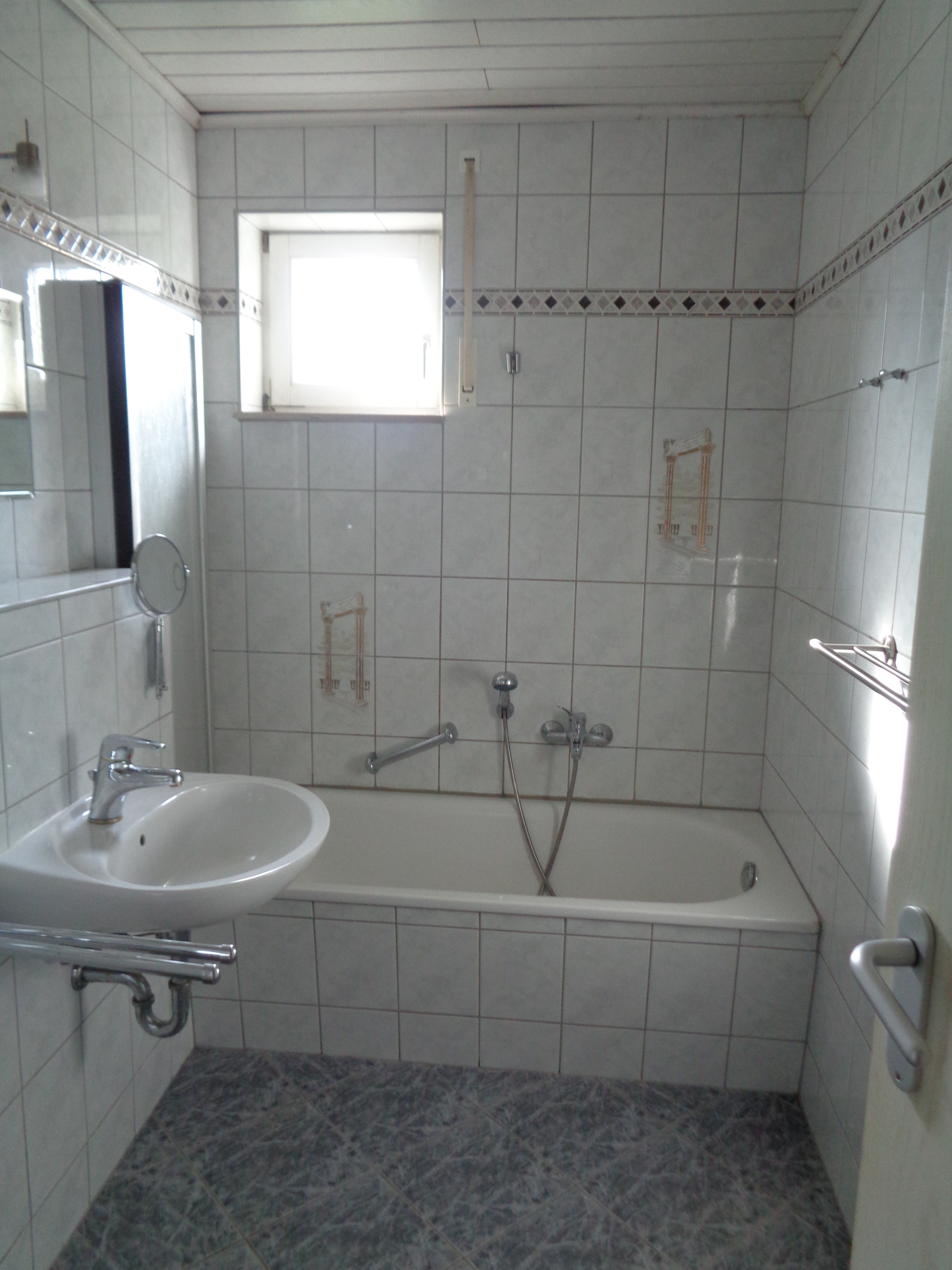- gefliestes Bad mit kleinem Fenster, Wanne, Handwaschbecken und WC